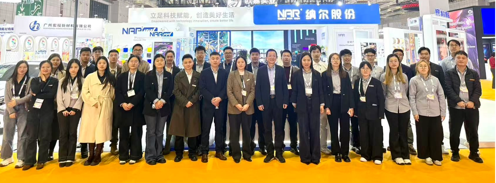 To express our sincere gratitude to our long-time partners, we held a special customer appreciation dinner on the first day of the exhibition under the theme "Unite as One, Forge Ahead into the Future – 2026, Together with NAR." Chairman You Aiguo outlined the company's vision and future development direction based on our corporate culture and business philosophy. Shen Weifeng, General Manager of the Digital Printing Materials Division, expressed his heartfelt thanks to partners who have stayed with us along the journey. Liu Hui, Technical R&D Director, focused on cutting-edge developments and delivered an insightful presentation on color wrapping film and new eco-friendly products. The dinner also honored outstanding partners, further strengthening our shared commitment to moving forward together.